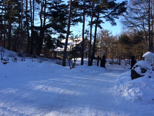 富士見の町中、鉢巻道路に近い道は凍結の上に雪がのっている状態です。